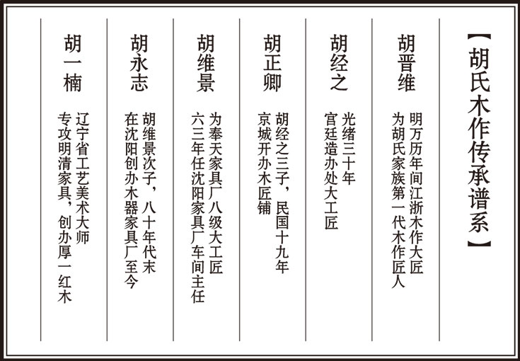 厚一红木前身为胡氏木作,历经家庭六代传人。